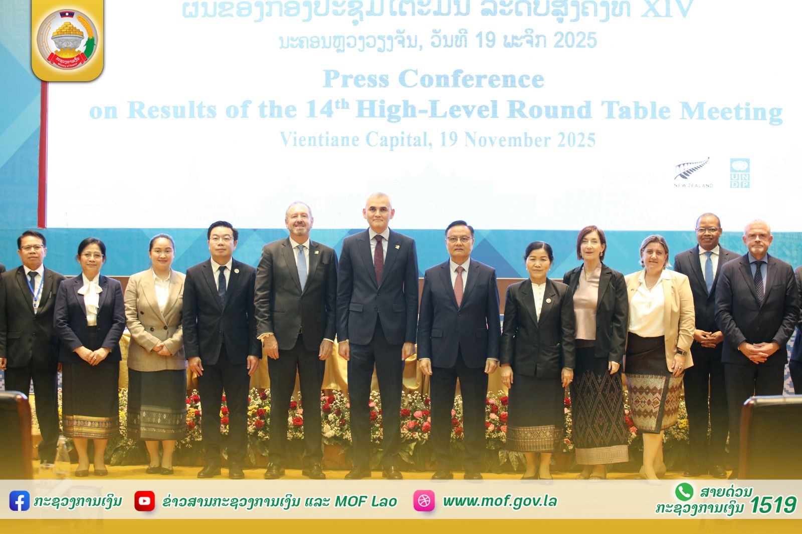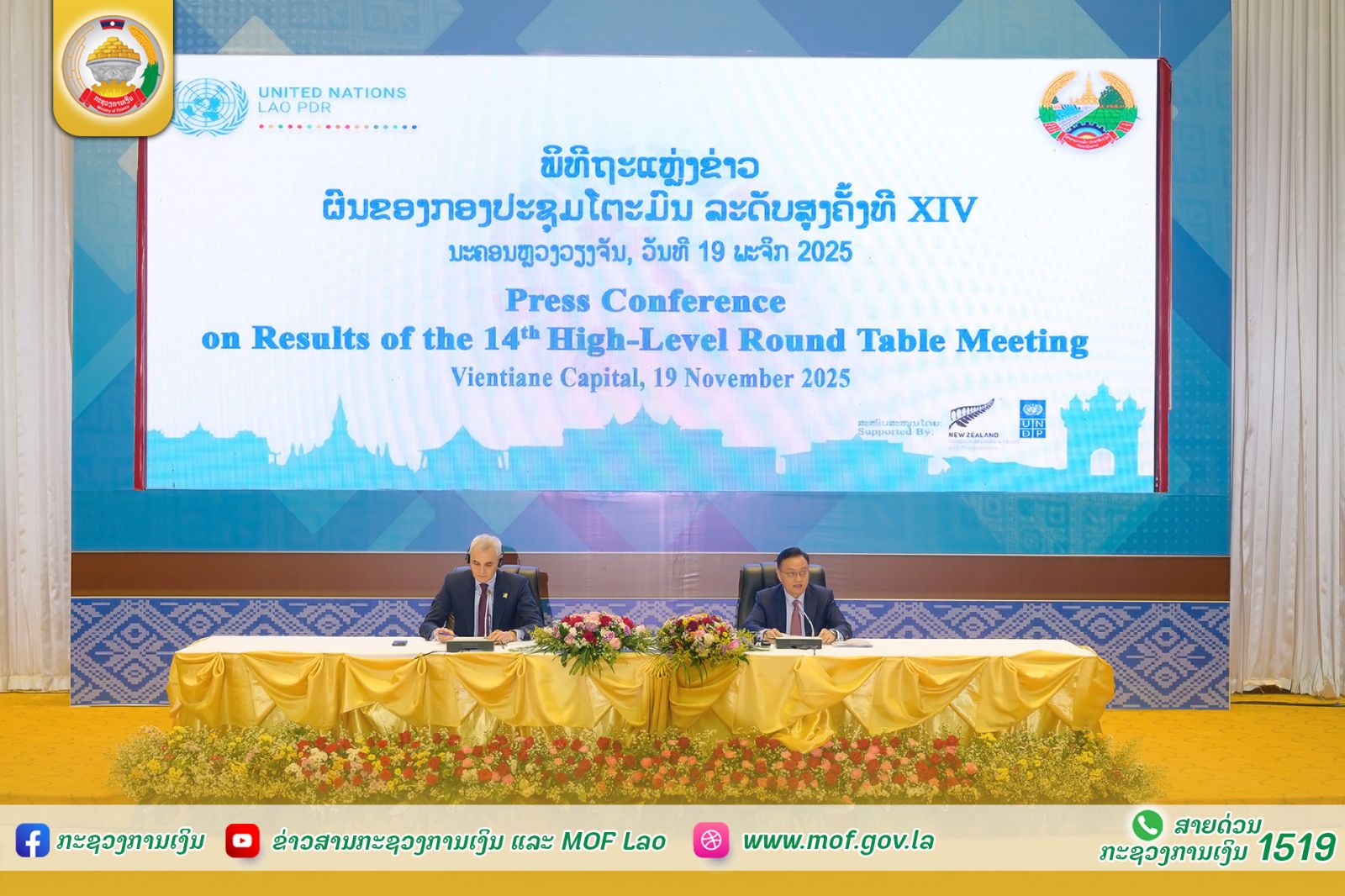 ໃນຕອນບ່າຍຂອງວັນທີ 19 ພະຈິກ 2025 ກະຊວງການເງິນ ຮ່ວມກັບ ອົງການສະຫະປະຊາຊາດ ປະຈຳ ສປປ ລາວ ໄດ້ຖະແຫຼ່ງຂ່າວຜົນສຳເລັດຂອງກອງປະຊຸມໂຕະມົນລະດັບສູງ ຄັ້ງທີ XIV ປີ 2025 ໂດຍການເປັນປະທ່ານ ຂອງທ່ານ ສັນຕິພາບ ພົມວິຫານ ລັດຖະມົນຕີ ກະຊວງການເງິນ, ຮອງປະທານ ຜູ້ປະຈຳການຄະນະຊີ້ນຳລະດັັບຊາດ ແລະ ທ່ານ ບັກໂຮເດຍ ເບີຄະນ໋ອຟ ຜູ້ປະສານງານອົງການສະຫະປະຊາຊາດ ປະຈຳ ສປປ ລາວ, ພ້ອມນີ້ຍັງມີບັນດາທ່ານ ຮອງລັດຖະມົນຕີ, ເອກອັກຄະລັດຖະທູດ, ຜູ້ຕາງໜ້າຈາກຄູ່ຮ່ວມພັດທະນາ, ພາກເອກະຊົນ, ອົງການຈັດຕັ້ງສາກົນ ແລະ ນັກຂ່າວ, ສື່ມວນຊົນ ທັງພາຍໃນ ແລະ ຕ່າງປະເທດ ເຂົ້າຮ່ວມ. ໃນພິທີ ທ່ານ ສັນຕິພາບ ພົມວິຫານ ລັດຖະມົນຕີ ກະຊວງການເງິນ, ຮອງປະທານ ຜູ້ປະຈຳການຄະນະຊີ້ນຳລະດັັບຊາດ ໄດ້ກ່າວມີຄຳເຫັນວ່າ: ຜົນສໍາເລັດກອງປະຊຸມໂຕະມົນ ລະດັບສູງ ຄັ້ງທີ XIV ປີ 2025, ເຊິ່ງໄດ້ຈັດຂຶ້ນ ເປັນເວລາ 1 ວັນເຕັມ ພາຍໃຕ້ຫົວຂໍ້: “ເພີ່ມທະວີການເປັນຄູ່ຮ່ວມ ເພື່ອການພັດທະນາ ທີ່ມີປະສິດທິຜົນ ເຂົ້າໃນການຈັດຕັ້ງປະຕິບັດ ແຜນພັດທະນາເສດຖະກິດ-ສັງຄົມ ແຫ່ງຊາດ 5 ປີ ຄັ້ງທີ X (2026-2030) ເພື່ອພ້ອມກັນກ້າວເຂົ້າສູ່ ການຫຼຸດພົ້ນອອກຈາກສະຖານະພາບດ້ອຍພັດທະນາ ຢ່າງໝັ້ນທຽງ, ມີສະຖຽນລະພາບ ແລະ ບັນລຸເປົ້າໝາຍການພັດທະນາແບບຍືນຍົງ” ເຊິ່ງຜົນຂອງກອງປະຊຸມດັ່ງກ່າວໄດ້ຮັບຮອງສຶບຕໍ່ສະໜັບສະໜູນ ໃນການປະຕິບັດວຽກງານການພັດທະນາຂອງ ສປປ ລາວ ເປັນຕົ້ນ: ໄດ້ຢືນຢັນຄືນໃໝ່ເຖິງຄຳໝັ້ນສັນຍາ ໃນການສະໜັບສະໜູນຢ່າງເຕັມສ່ວນ ເພື່ອຈັດຕັ້ງປະຕິບັດແຜນພັດທະນາເສດຖະກິດ-ສັງຄົມ ແຫ່ງຊາດ 5 ປີ ຄັ້ງທີ XIV ແລະ ເປົ້າໝາຍການພັດທະນາແບບຍືນຍົງ (SDGs); ສືບຕໍ່ແກ້ໄຂ ແລະ ຟື້ນຟູເສດຖະກິດ ທີ່ເປັນຜົນພວງຈາກການແຜ່ລະບາດຂອງພະຍາດໂຄວິດ 19 ແລະ ຄວາມຫຍຸ້ງຍາກທາງດ້ານເສດຖະກິດ-ການເງິນໃນໄລຍະຜ່ານມາ; ສືບຕໍ່ຮັກສາສະຖຽນລະພາບດ້ານເສດຖະກິດມະຫາພາກ ໃນການ ຄຸ້ມຄອງອັດຕາເງິນເຟີ້, ອັດຕາແລກປ່ຽນ, ລາຄາສິນຄ້າ, ປັບປຸງການເກັບລາຍຮັບງົບປະມານທັນສະໄໝ; ສືບຕໍ່ສຸມໃສ່ປັບປຸງໂຄງລ່າງພື້ນຖານ ຕາມແລວທາງເສດຖະກິດຕ່າງໆ; ສືບຕໍ່ສຸມໃສ່ພັດທະນາຊັບພະຍາກອນມະນຸດ ເພື່ອປັບປຸງຄຸນນະພາບການສືກສາໃຫ້ດີຂື້ນກວ່າເກົ່າ; ສືບຕໍ່ການກະກຽມຄວາມພ້ອມ ໃນການຫຼຸດພົ້ນອອກຈາກສະຖານະພາບດ້ອຍະເທດພັດທະນາ ຂອງ ສປປ ລາວ ພ້ອມນັ້ນ, ທ່ານ ລັດຖະມົນຕີ ຍັງໄດ້ຮຽກຮ້ອງໃຫ້ບັນດາກະຊວງ, ອົງການກ່ຽວຂ້ອງ ຢູ່ສູນກາງ ແລະ ອົງການປົກຄອງທ້ອງຖິ່ນ, ບັນດາຄູ່ຮ່ວມພັດທະນາ, ພາກເອກະຊົນ ແລະ ອົງການຈັດຕັ້ງທາງສັງຄົມ ສືບຕໍ່ຍົກສູງຄວາມຮັບຜິດຊອບ, ຄວາມເປັນເຈົ້າການ ທັງເພີ່ມທະວີການປະສານງານສົມທົບເຊິ່ງກັນ ແລະ ກັນຢ່າງກົມກຽວ ເພື່ອຜັນຂະຫຍາຍຜົນກອງປະຊຸມໂຕະມົນລະດັບສູງ ຄັ້ງທີ XIV ປີ 2025 ເຂົ້າໃນການຈັດຕັ້ງປະຕິບັດແຜນພັດທະນາເສດຖະກິດ-ສັງຄົມ ແຫ່ງຊາດ 5 ປີ ຄັ້ງທີ X ໃຫ້ສຳເລັດຜົນຕາມຄາດໝາຍທີ່ວາງ