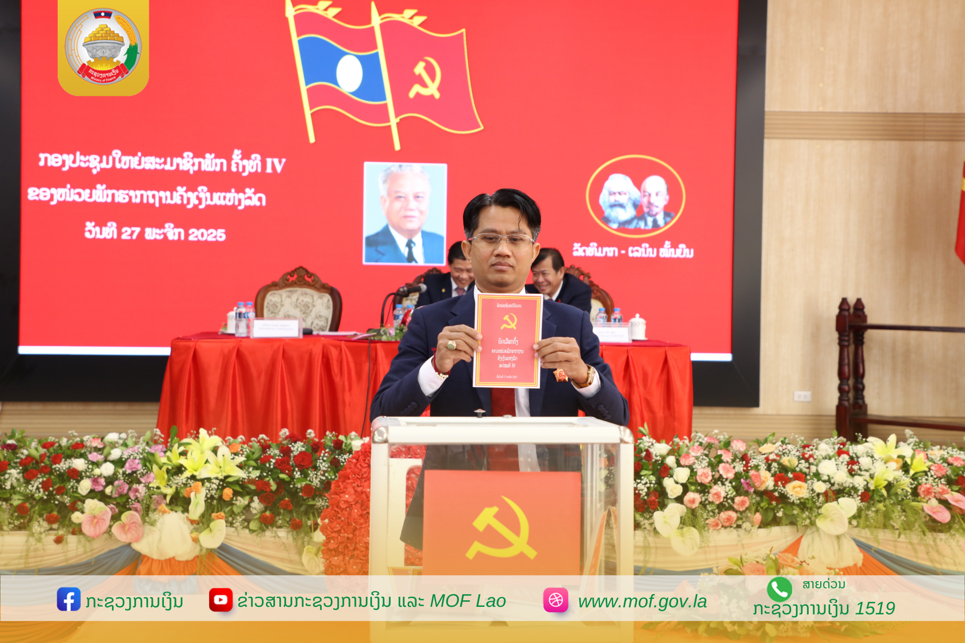 ໃນວັນທີ 27 ພະຈິກ 2025 ໜ່ວຍພັກຮາກຖານຄັງເງິນແຫ່ງລັດ ໄດ້ເປີດກອງປະຊຸມໃຫຍ່ສະມາຊິກພັກ ຄັ້ງທີ IV ຂື້ນຢ່າງເປັນທາງການ ໃຫ້ກຽດເຂົ້າຮ່ວມເປັນປະທານຂອງສະຫາຍ ພູວົງ ກິດຕະວົງ ກໍາມະການປະຈໍາພັກກະຊວງ ຮອງລັດຖະມົນຕີກະຊວງການເງິນ, ສະຫາຍ ອຸບັນ ສຸພິດາ ກໍາມະການປະຈໍາພັກກະຊວງ ຫົວໜ້າກົມຈັດຕັ້ງ ແລະ ສະຫາຍ ນາງ ຍອດ ແພງສົມບັດ ເລຂາໜ່ວຍພັກຮາກຖານຄັງເງິນແຫ່ງລັດ, ມີຄະນະໜ່ວຍພັກຮາກຖານ, ສະມາຊິກພັກພາຍໃນໜ່ວຍພັກ ພ້ອມດ້ວຍແຂກທີ່ຖືກເຊີນ ເຂົ້າຮ່ວມ.