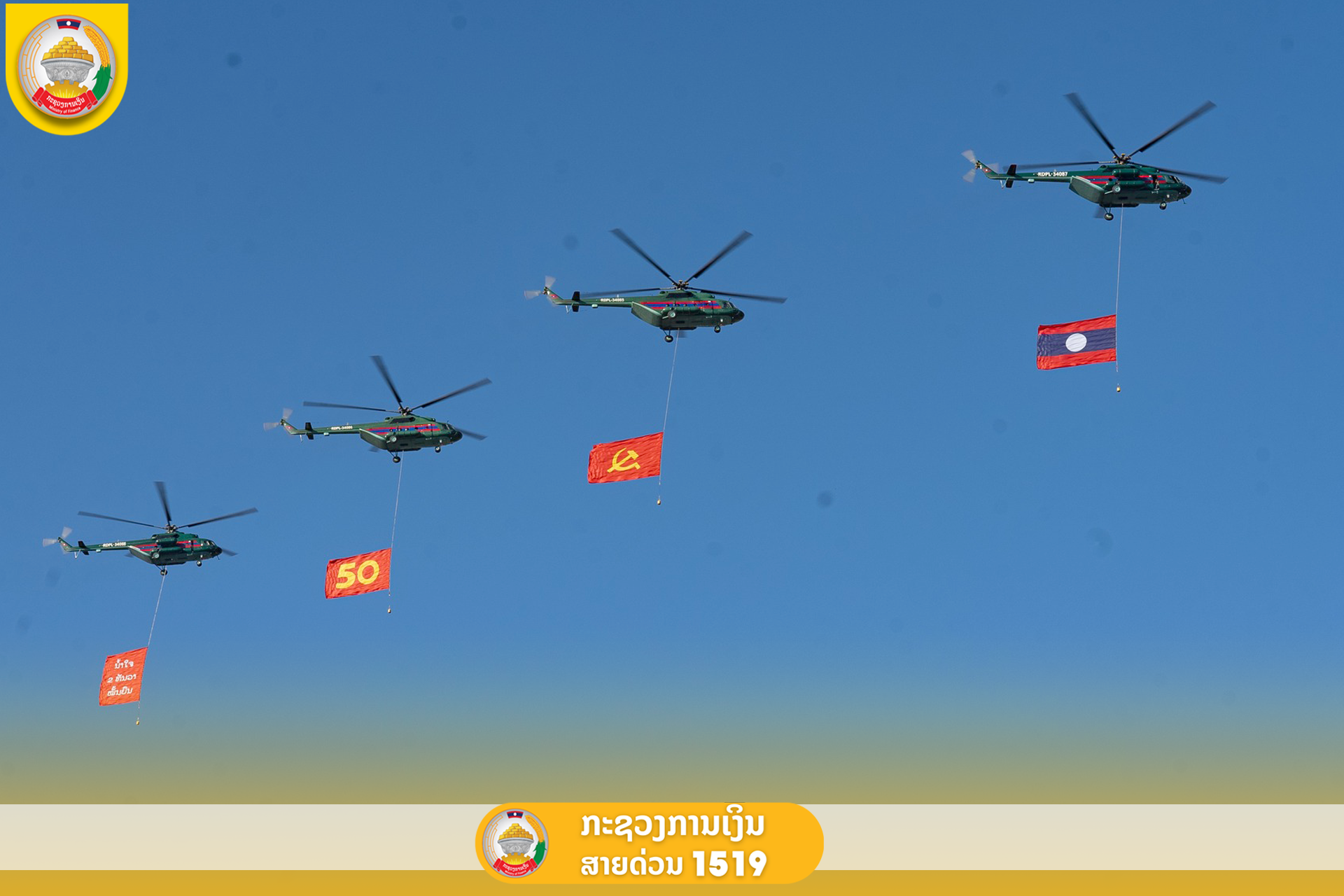 ຈາກນັ້ນ, ໃນພິທີ ຍັງໄດ້ຮັບຊົມການເດີນຂະບວນສວນສະໜາມຂອງບັນດາກ້ອນກຳລັງປະກອບອາວຸດປ້ອງກັນຊາດ-ປ້ອງກັນຄວາມສະຫງົບ, ກ້ອນບັນດາກະຊວງ, ອົງການຈັດຕັ້ງມະຫາຊົນ ແລະ ຮັບຊົມການສະແດງຂະບວນຝູງບິນ ທີ່ປະກອບດ້ວຍທຸງຊາດ, ທຸງພັກ, ທຸງ 50 ປີ, ຄຳຂວັນນໍ້າໃຈວັນຊາດທີ 2 ທັນວາ ໝັ້ນຍືນ ແລະ ການສະແດງຍົນສູ້ຮົບ ຍັກ 130 ຂອງກອງບັນຊາການທະຫານອາກາດ ກອງທັບປະຊາຊົນລາວ ຢ່າງສະຫງ່າງາມ.