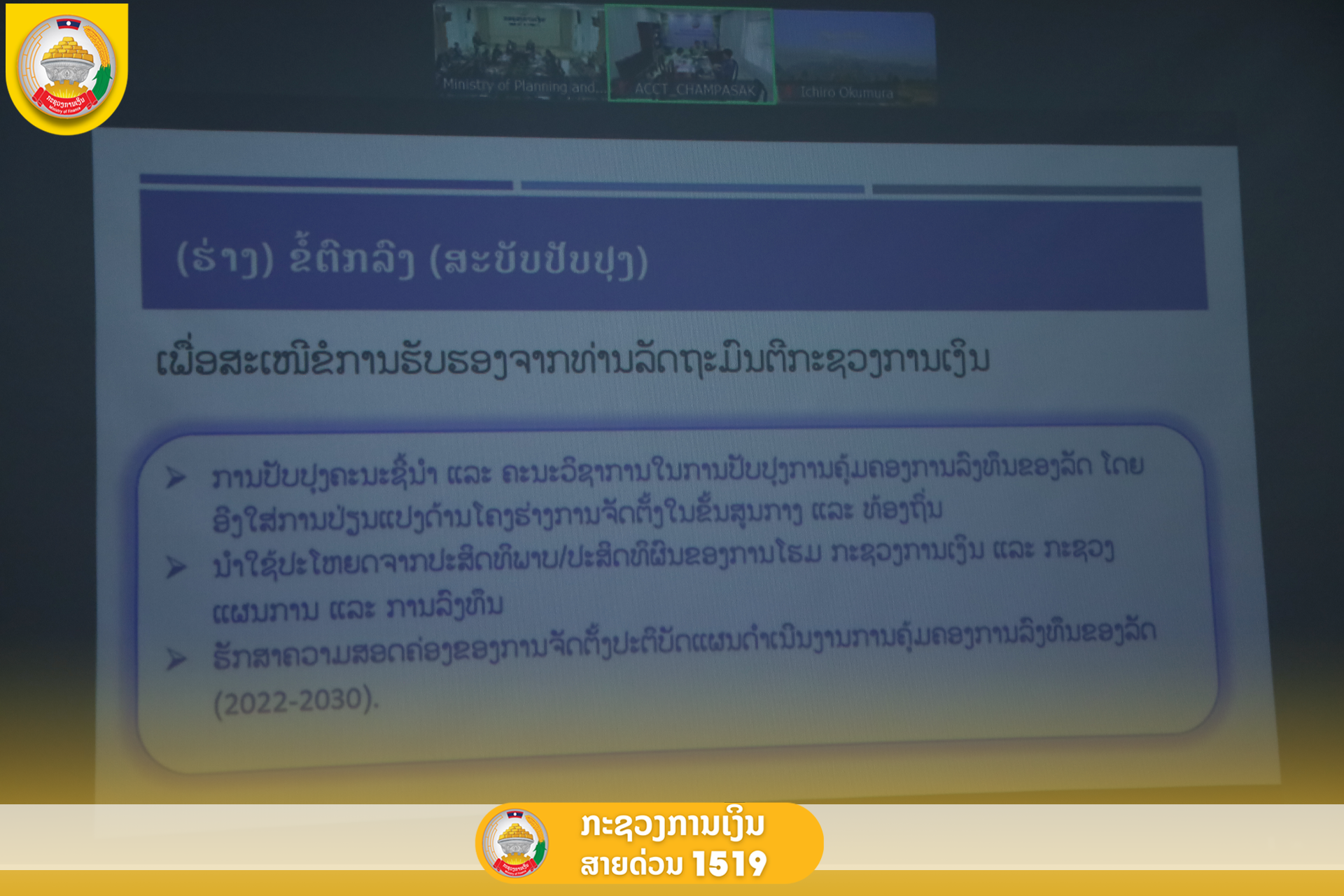 ໃນວັນທີ 12 ທັນວາ 2025, ກົມແຜນການ ກະຊວງການເງິນ ຮ່ວມກັບອົງການໄຈກາ ປະຈໍາ ສປປ ລາວ ໄດ້ຈັດກອງປະຊຸມ ຄະນະປັບປຸງການຄຸ້ມຄອງການລົງທຶນຂອງລັດ ຄັ້ງທີ VIII ໂດຍການເປັນປະທານຮ່ວມຂອງ ທ່ານ ນາງ ພອນວັນ ອຸທະວົງ ຮອງລັດຖະມົນຕີ ກະຊວງການເງິນ ແລະ ທ່ານ ນາງ ມິຢາໂກະ ໂຄບາຢາຊິ ຫົວໜ້າອົງການໄຈກາ ປະຈໍາ ສປປ ລາວ, ມີຕາງໜ້າຈາກບັນດາກົມກ່ຽວຂ້ອງອ້ອມຂ້າງກະຊວງການເງິນ, ຈາກບັນດາກະຊວງ, ອົງການຈັດຕັ້ງສາກົນ ແລະ ພະແນກການເງິນ (ນະຄອນຫຼວງວຽງຈັນ, ແຂວງຈໍາປາສັກ, ແຂວງອຸດົມໄຊ) ເຂົ້າຮ່ວມ.
