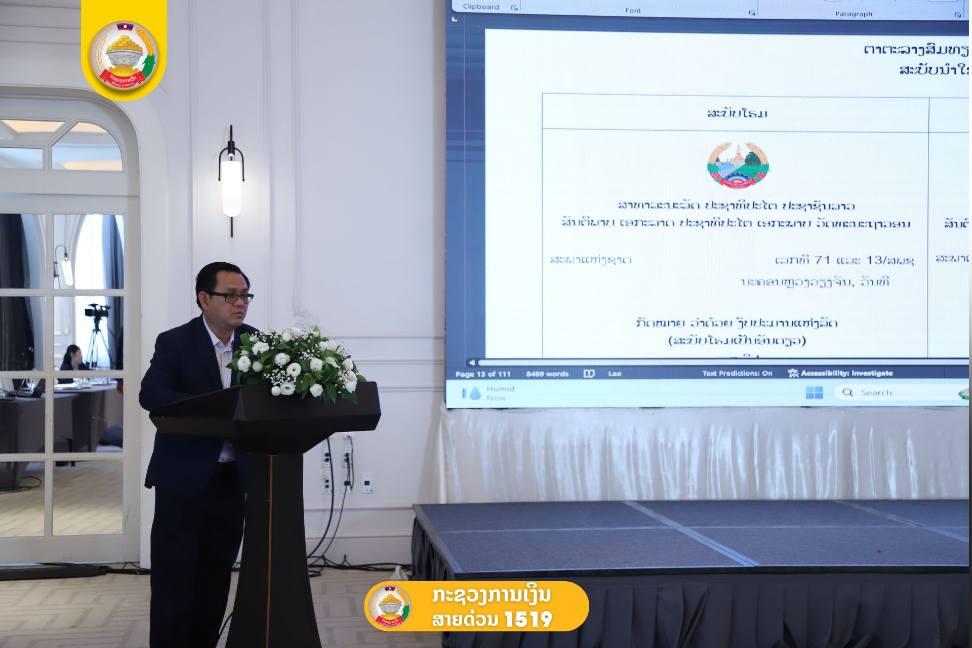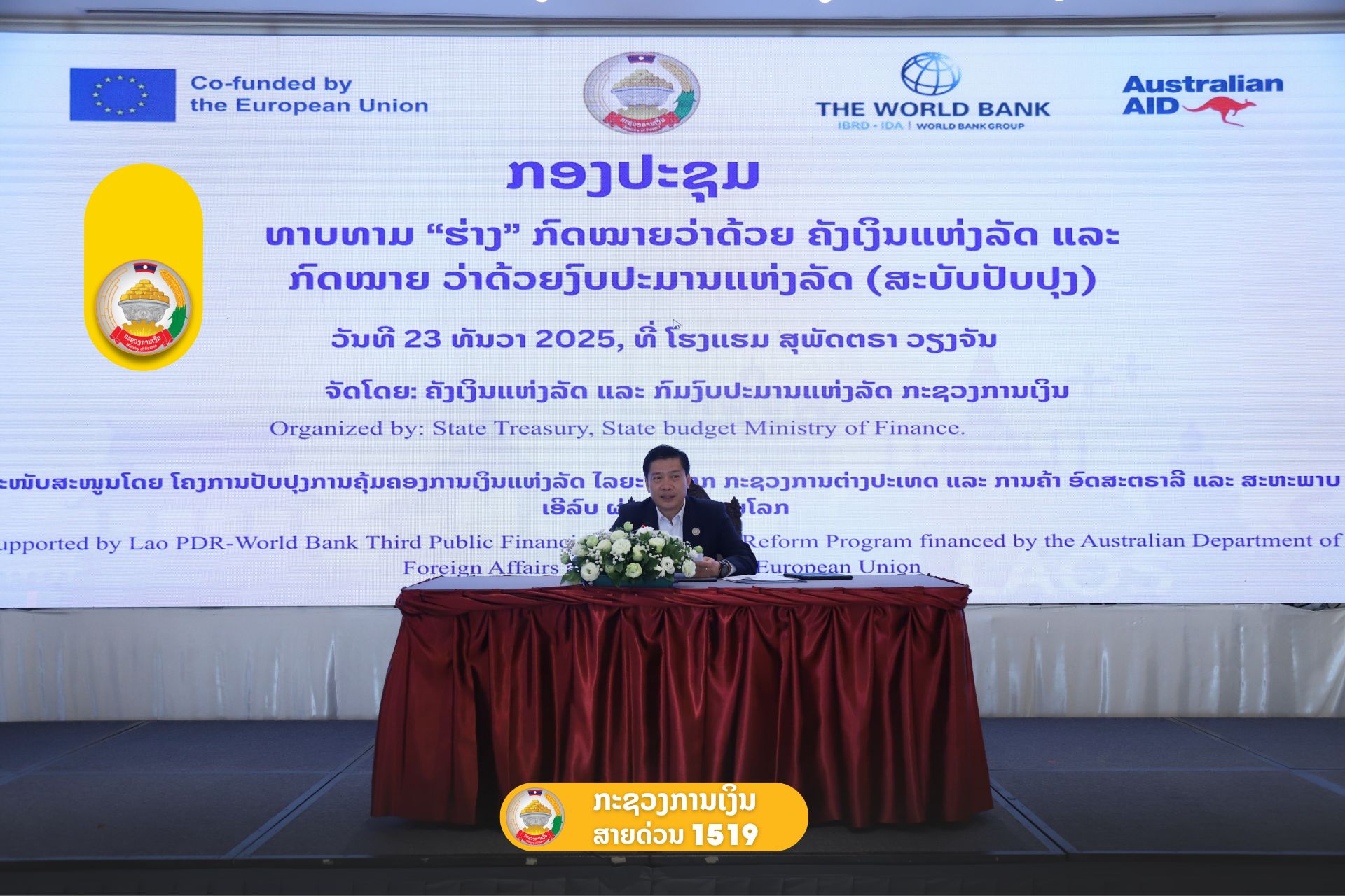 ໃນວັນທີ 23 ທັນວາ 2025 ໄດ້ມີກອງປະຊຸມ ທາບທາມຮ່າງກົດໝາຍວ່າດ້ວຍຄັງເງິນແຫ່ງລັດ ແລະ ກົດໜາຍ ວ່າດ້ວຍງົບປະມານແຫ່ງລັດ (ສະບັບບັບປຸງ) ຂັ້ນສູນກາງ. ໂດຍການເປັນປະ ທານຂອງທ່ານ ພູວົງ ກິດຕະວົງ ຮອງລັດຖະມົນຕີກະຊວງການເງິນ ໂດຍມີຕາງໜ້າຈາກ ບັນດາກະຊວງ ອົງການ ທຽບເທົ່າກ່ຽວຂ້ອງ ຂັ້ນສູຸນກາງ ແລະ ກົມທີ່ກ່ຽວຂ້ອງເຂົ້າຮ່ວມ.
