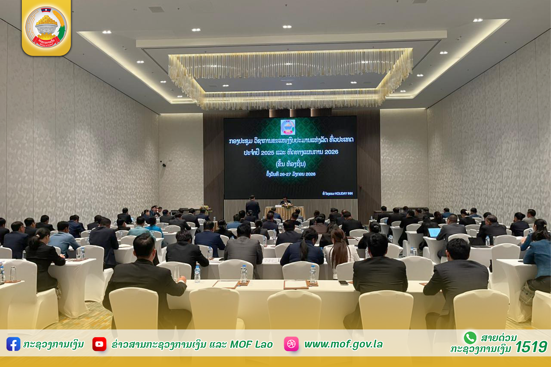 ໃນວັນທີ 26 ມັງກອນ 2026 ທີ່ນະຄອນຫຼວງວຽງຈັນ, ກົມງົບປະມານແຫ່ງລັດ ກະຊວງການເງິນ ໄດ້ຈັດກອງປະຊຸມ ວິຊາການຂະແໜງງົບປະມານແຫ່ງລັດ ທົ່ວປະເທດ ປະຈໍາປີ 2025 ແລະ ທິດທາງແຜນການ 2026 ໂດຍການເປັນປະທານຂອງ ທ່ານ ໜູເຊີຍ ພົມສີຈັນ ຫົວໜ້າກົມງົບປະມານແຫ່ງລັດ, ມີຮອງຫົວໜ້າກົມ, ຄະນະພະແນກ, ຕາງໜ້າຈາກຫ້ອງການ, ບັນດາກົມອ້ອມຂ້າງ ພ້ອມດ້ວຍຜູ້ຕາງໜ້າຈາກບັນດາກະຊວງ, ອົງການທຽບເທົ່າ ແລະ ພະແນກການເງິນ, ຂະແໜງງົບປະມານ ນະຄອນຫຼວງວຽງຈັນ, ບັນດາແຂວງ ແລະ ເມືອງ ໃນຂອບເຂດທົ່ວປະເທດ ເຂົ້າຮ່ວມ.